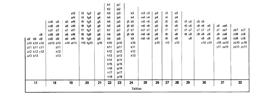 | Medida nominal (mm) | 1 | 2 | 3 | 4 | 5 | 6 | 7 | 8 | 9 | 10 | 11 | 12 | 13 | 14 | 15 | 16 | 17 | 18 |